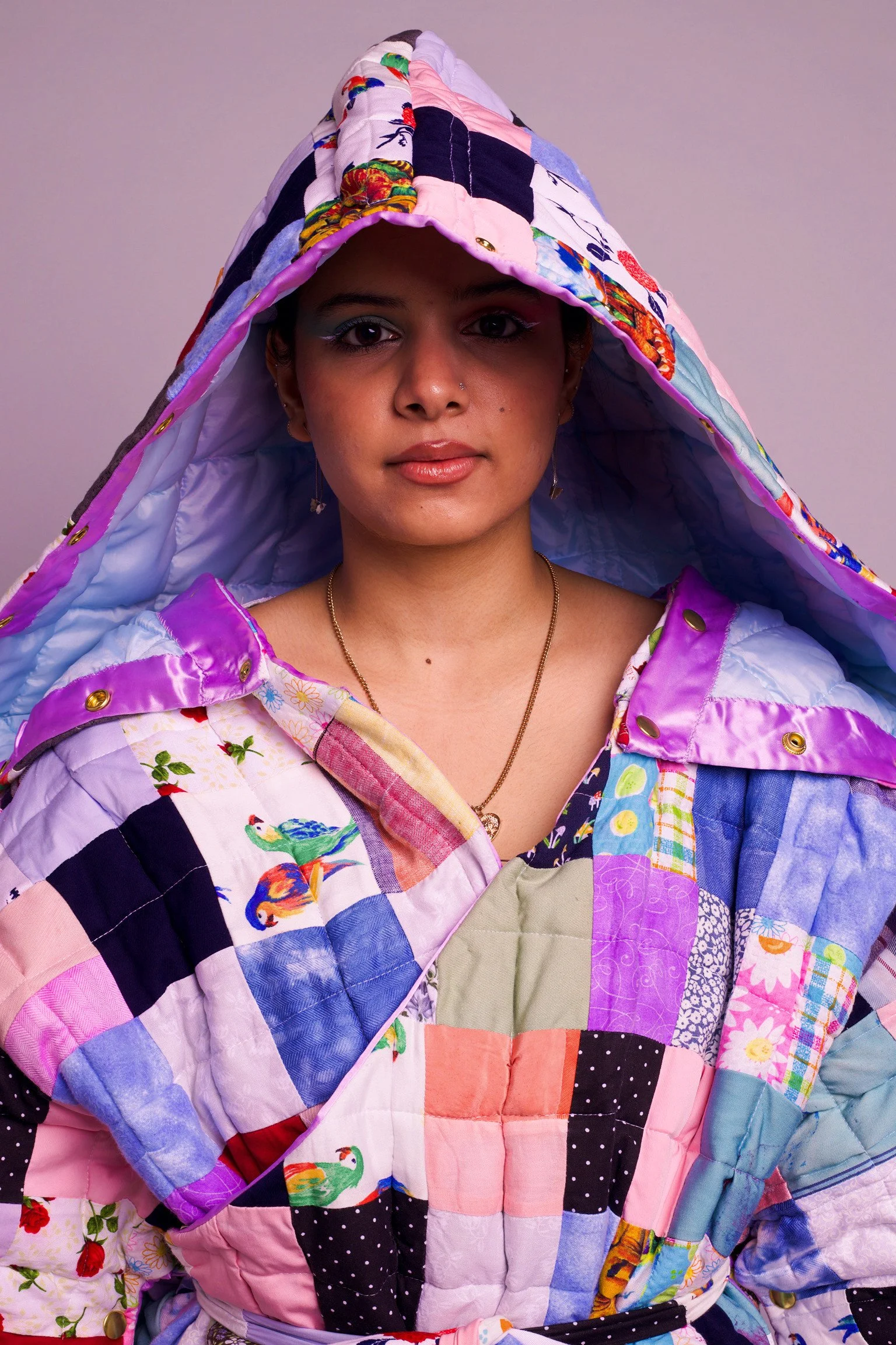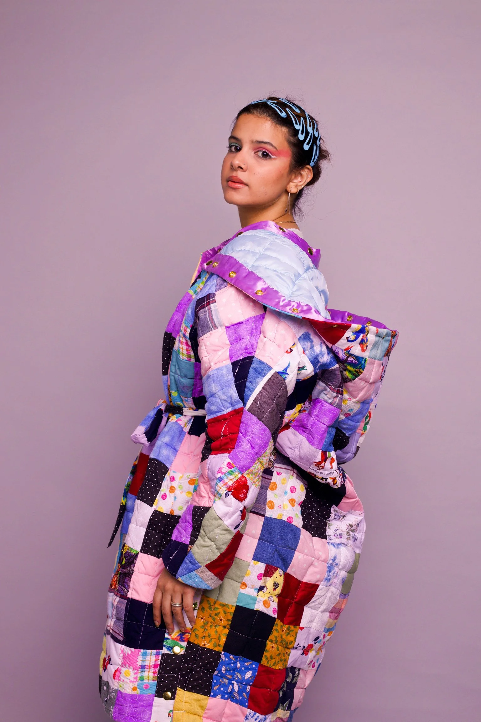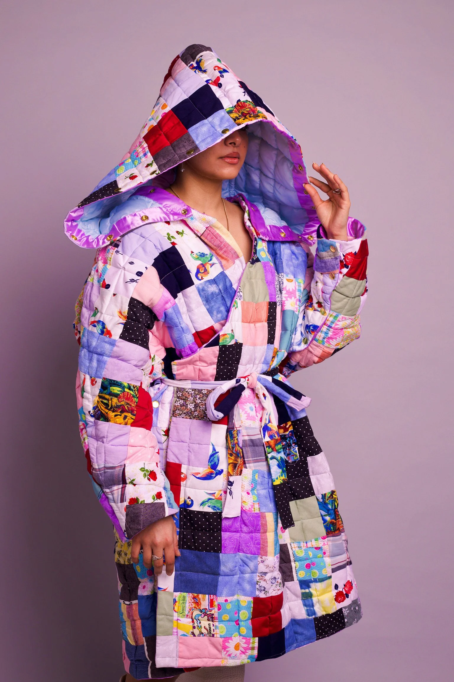 The big wrap coat was meant for anyone to be able to wear and feel as if it was a big warm hug from someone comforting. With removal snaps for the hood and the sides, the coat lays fully flat and can be used as a pillow and blanket respectively. As for material usage, there is a heavy presence of quilting/ patchworking and hand sewing due to a familial feeling. But further due to my interests in sustainability. Because of this, all patches on the coat were old second-hand recycled materials that were donated by family and friends.