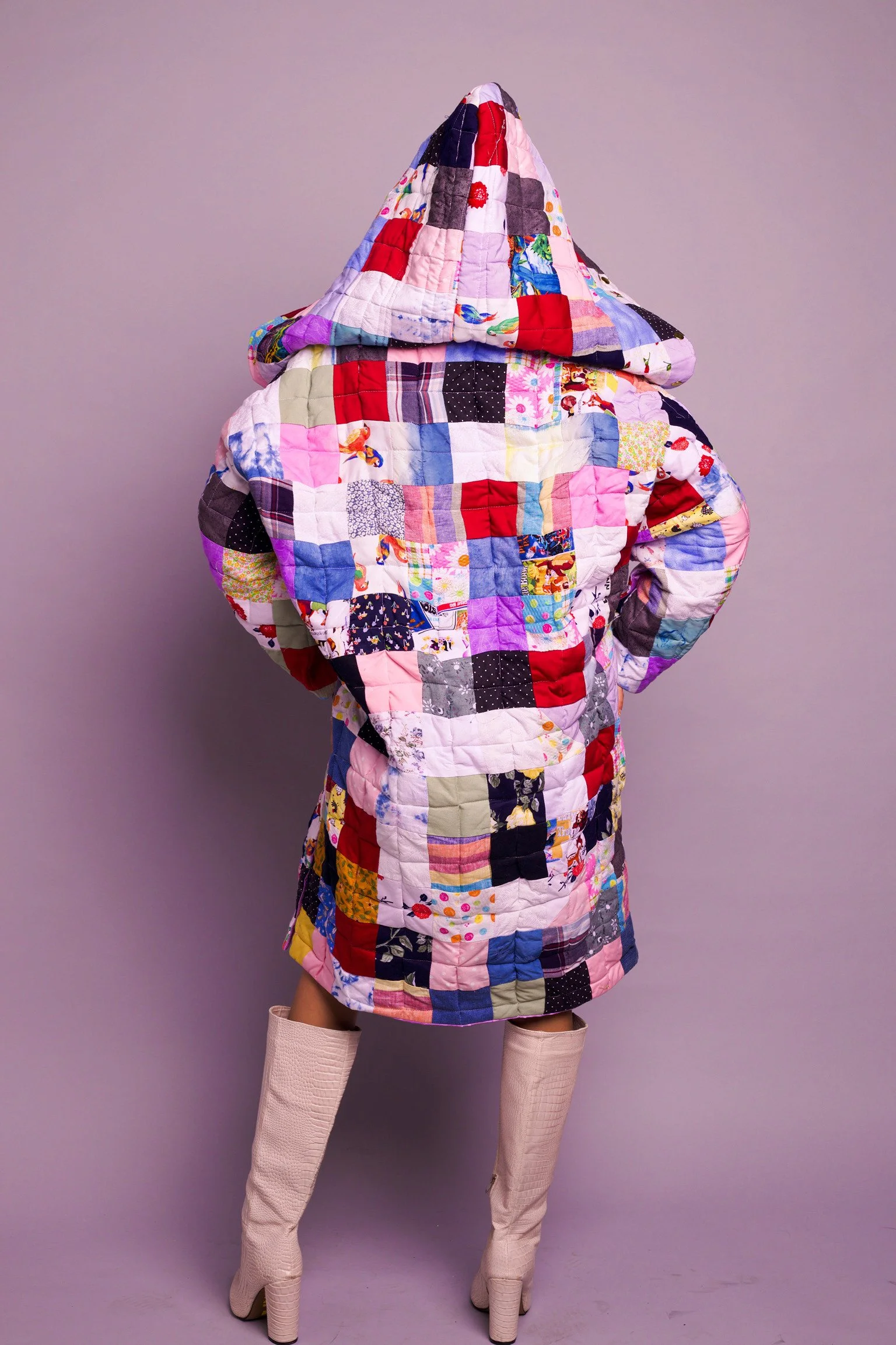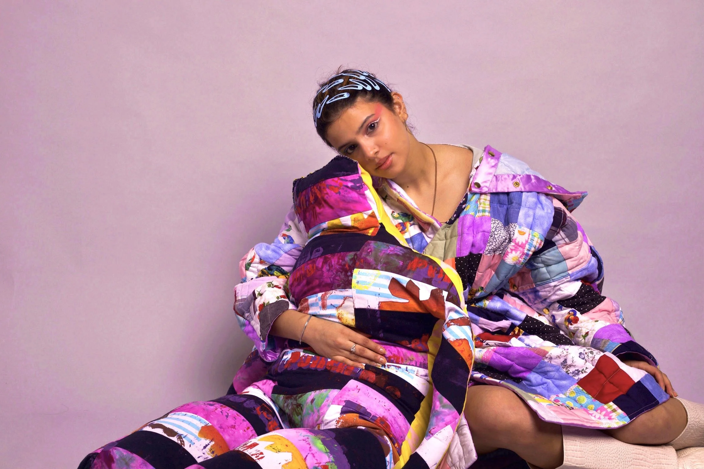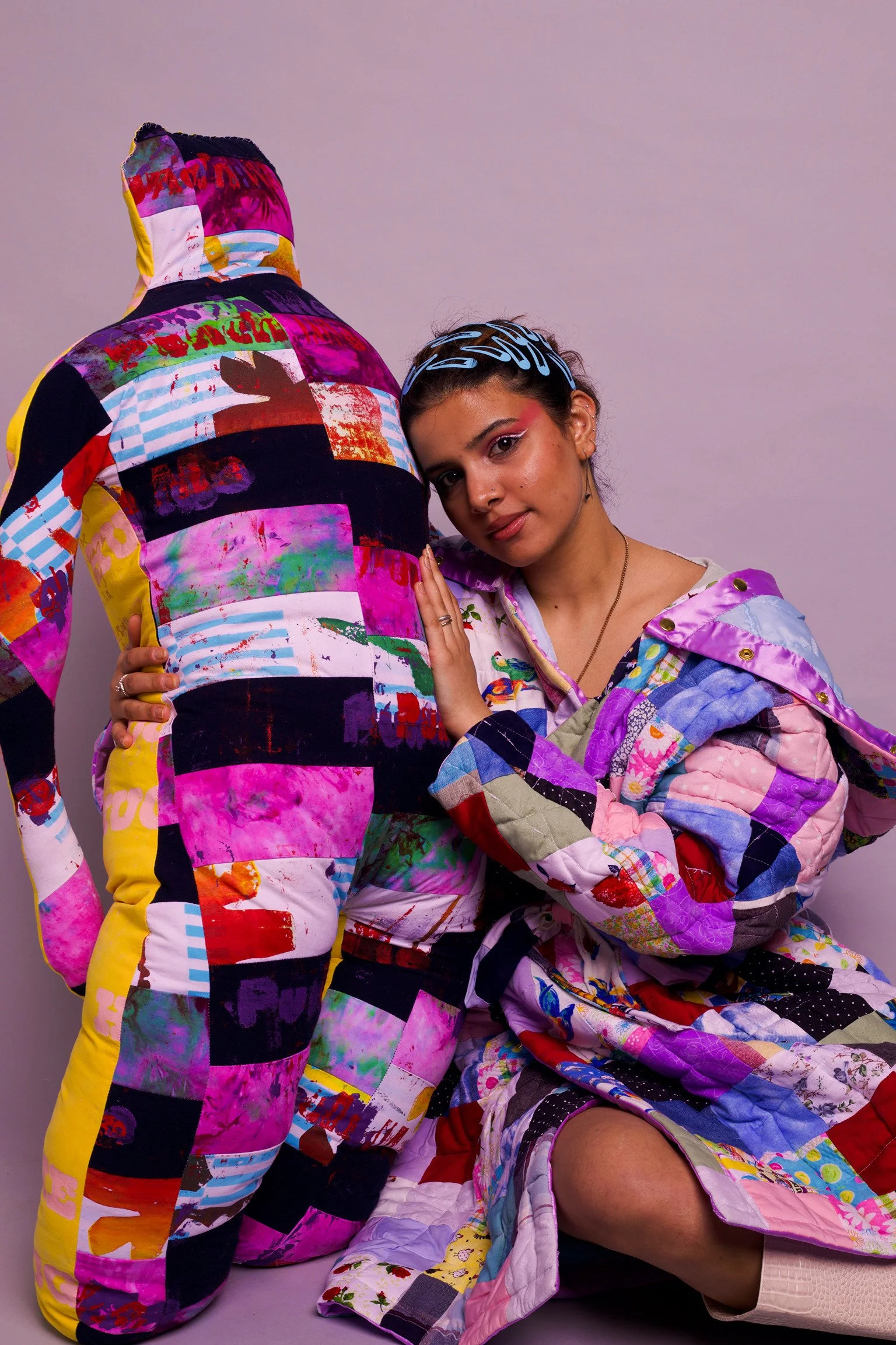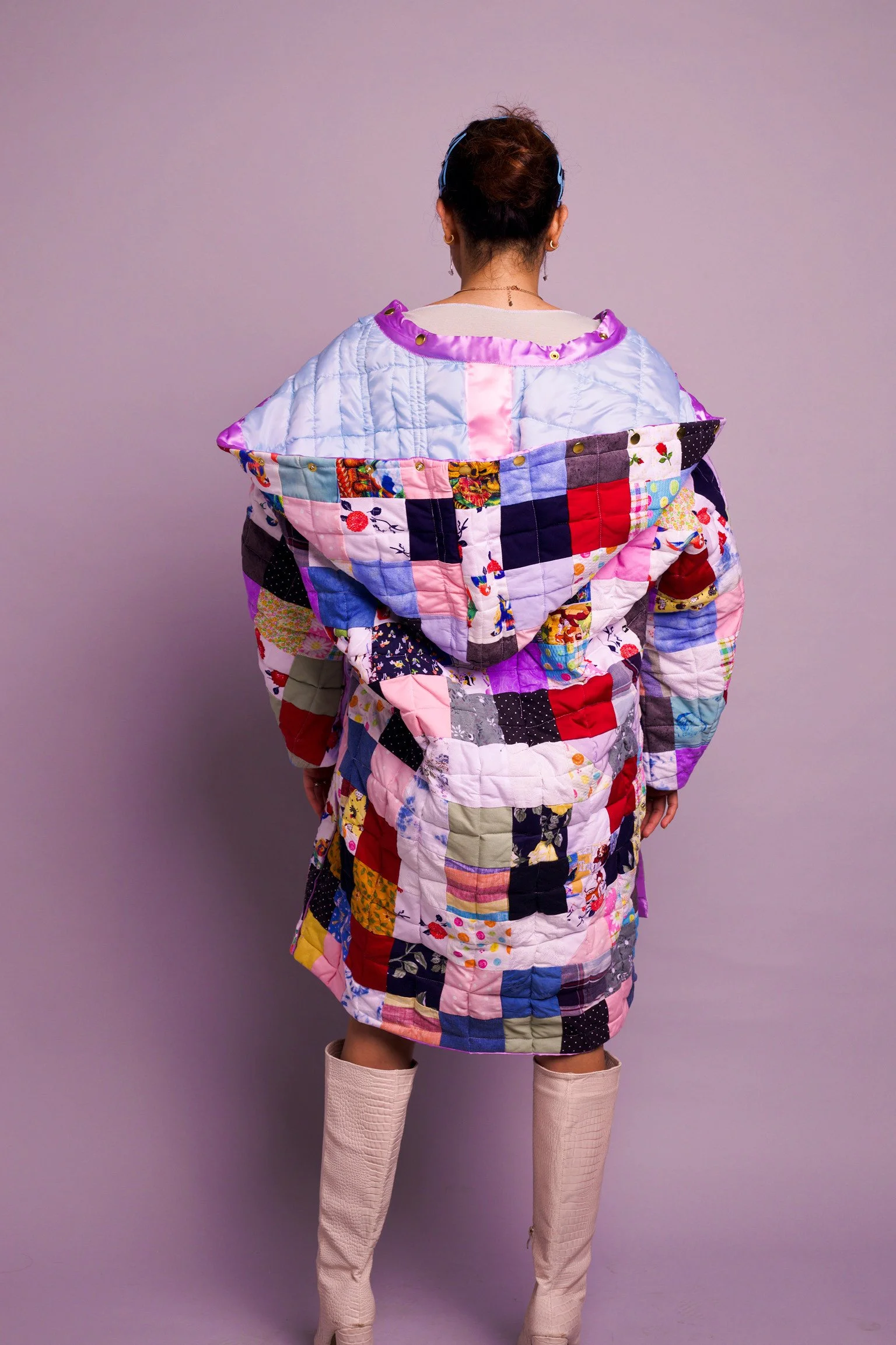The big wrap coat was meant for anyone to be able to wear and feel as if it was a big warm hug from someone comforting. With removal snaps for the hood and the sides, the coat lays fully flat and can be used as a pillow and blanket respectively. As for material usage, there is a heavy presence of quilting/ patchworking and hand sewing due to a familial feeling. But further due to my interests in sustainability. Because of this, all patches on the coat were old second-hand recycled materials that were donated by family and friends.